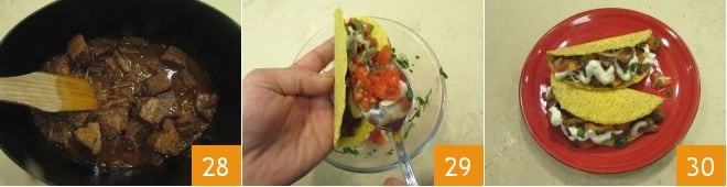 When the meat is cooked, take it out of the oven and check that it is tender enough to shred easily 28. At this point, you are ready to assemble the tacos: take the ready-made tacos, fill them with the meat, add a spoonful of tomato salad 29, and top with the yogurt sauce: your tacos with meat are ready to be enjoyed 30!