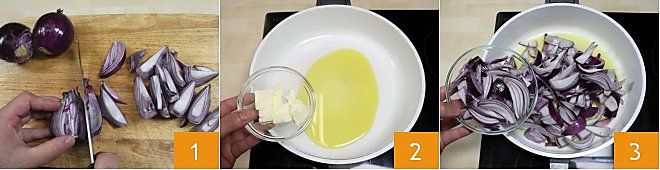 To prepare the sliced beef with sweet and sour onions, start by peeling the red onions. Cut them into 4 parts and then into smaller wedges 1, then take a non-stick pan and heat the extra virgin olive oil, when it is hot, add the butter 2. Once the butter has melted, add the red onion wedges 3 and let them gently sauté.