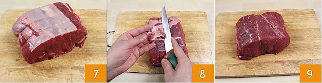 Now take care of the meat: remove the meat from the fridge at least an hour before cooking, so it's not too cold but at room temperature. Place the sirloin or entrecôte on a cutting board 7 and, with a sharp knife, remove the layer of fat on the surface 8 until completely trimmed 9.