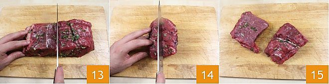 Transfer the flavored meat back to the cutting board and divide it into two 13, then cut each piece in half 14 to obtain 4 steaks 15.