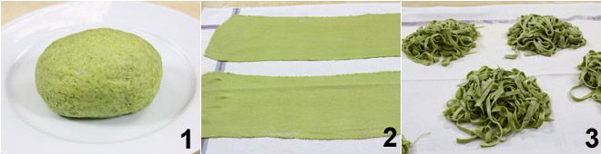 To prepare the tagliatelle, follow the green pasta recipe that you can find here with the quantities indicated in this sheet. Once you have obtained a smooth and homogeneous dough 1, let it rest covered for at least half an hour in a cool place. Roll out the dough 2 and make the tagliatelle 3 (by rolling and then cutting it by hand following the instructions Homemade pasta (sheets and shapes) or by using the appropriate machine).