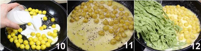 In a pan, heat the oil and butter and sauté two garlic cloves, which you will then remove; add the meatballs, sauté them for 2 minutes, then deglaze with brandy, add the cream 10, adjust salt and pepper 11, and then turn off the heat. Cook the tagliatelle in plenty of salted water and then, once drained, add them to the pan along with the sauce 12. Toss everything for a couple of minutes, then plate, dividing the meatballs among the various plates. Happy International Women's Day!!!!
