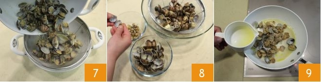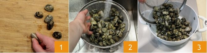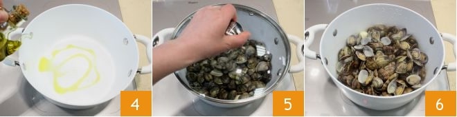 and a peeled garlic clove and let it sauté for a few moments. Drain the clams well and pour them into the pan 4, cover with the lid 5 and turn up the heat: in this way, the shells will open with the heat. You must turn off the heat immediately after they have fully opened 6 to avoid compromising the tenderness of the seafood with prolonged cooking.