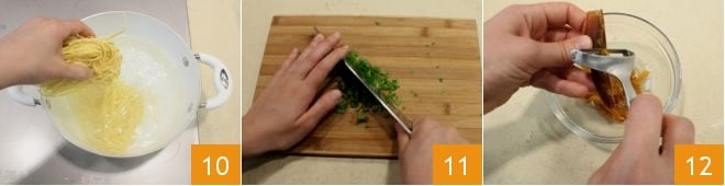 Bring plenty of water to a boil, salt to taste, and cook the tagliatelle for a few minutes, following the instructions on the package 10. Meanwhile, chop the parsley 11 and grate the bottarga 12.