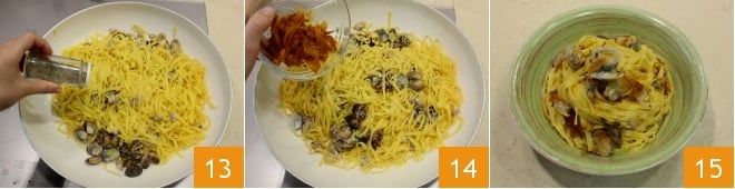 Drain the tagliatelle into the pan with the sauce, season with pepper to taste 13, then add the bottarga 14 and the parsley. Mix well and serve the tagliatelle with bottarga, clams, and lemon piping hot 15!