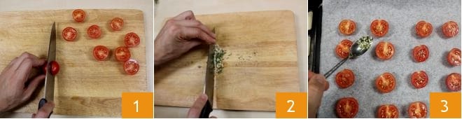 To prepare the tagliatelle with confit cherry tomatoes, honey mushrooms, and pesto, start with the Cherry Tomatoes Confit: wash them under plenty of running water and then dry them with a cloth or kitchen paper; place them on a cutting board and cut them all in half 1. Distribute them on a baking tray lined with parchment paper with the cut side facing up. At this point, prepare the thyme and garlic mince 2 and pour it over the cherry tomatoes along with the oregano 3.