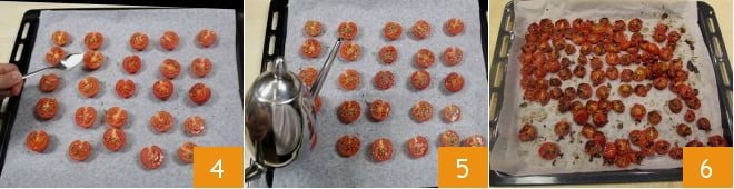 Salt and pepper to taste, then add the sugar, distributing it evenly 4. Drizzle with a little oil 5 and bake in a preheated static oven at 284°F for about 2 hours, until the cherry tomatoes' water has evaporated and they appear slightly roasted but not dry 6.