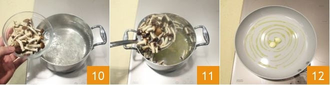 Meanwhile, place a pot with plenty of water on the stove, which you will use for boiling the honey mushrooms. When the water is almost boiling, blanch them for 15 minutes 10, removing the foam that forms on the surface during cooking. After the necessary time, turn off and drain the mushrooms well 11. Place a non-stick pan on the stove with the oil and garlic clove 12.