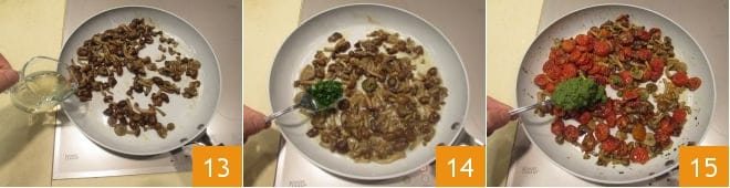 When the garlic has taken on color, remove it and sauté the honey mushrooms over high heat for 10 minutes, deglazing with white wine 13. Add the chopped parsley 14, adjusting the salt to your liking. Shortly before the end of cooking, add the confit cherry tomatoes and the pesto you prepared 15. At this point, turn off the heat and mix well with a spatula to blend all the ingredients well.