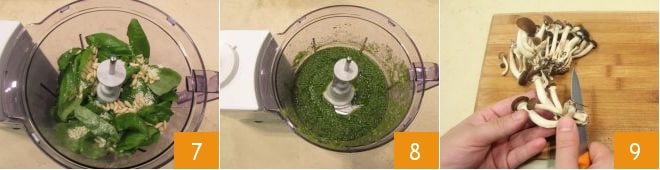 Meanwhile, focus on the Genoese pesto (Pesto alla genovese): clean the basil leaves with a soft cloth, then place them in a mixer along with the grated cheese and a pinch of salt. Add the pine nuts 7 and olive oil, then activate the mixer until you obtain a dense cream 8. Transfer the pesto you obtained to a bowl and set aside. Then proceed with the preparation of the dressing. Start by cleaning the mushrooms: with a sharp knife with a smooth blade, remove the earthy part on the stem, scraping it gently to remove any trace of soil 9; with a brush, gently remove any residues.