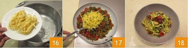 Place a pot with plenty of salted water on the stove. When the water is almost boiling, cook the tagliatelle for 5 minutes or the time indicated on the package 16 and then drain the pasta. Mix the tagliatelle with the dressing 17, sautéing everything for 1-2 minutes at most. Finally, plate and serve your tagliatelle with confit cherry tomatoes, honey mushrooms, and pesto, garnishing with pine nuts and some basil leaves to taste 18.