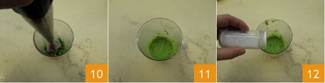 Crumble the ricotta into a small bowl 7 and place both in the refrigerator. After 20 minutes, put a pot full of salted water on the stove and bring it to a boil, it will be used for cooking the pasta. In the meantime, transfer the cooked peas into a blender 8 and add some broth 9.