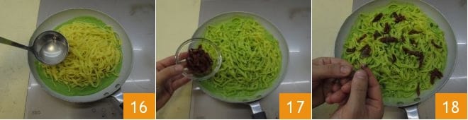 Sauté the tagliatelle, adding cooking water as needed 16, the sun-dried tomatoes 17, thyme leaves 18, and freshly ground pepper to taste.