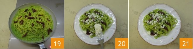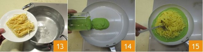 As soon as the water starts to boil, cook the tagliatelle 13. Meanwhile, transfer the pea cream into another pan 14 and once the pasta is cooked, drain it (keeping some of the cooking water aside) and transfer it to the pan 15.