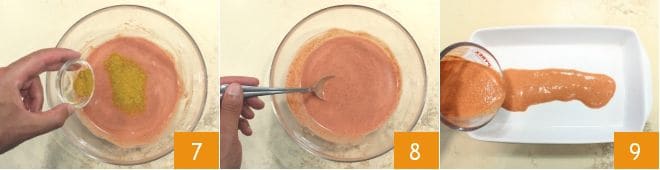 Finally, add the curry 7 and adjust the salt, if necessary. Mix again to combine everything 8, then pour part of the sauce into a baking dish 9. Remember to set aside some sauce to drizzle over the salmon fillets before baking.