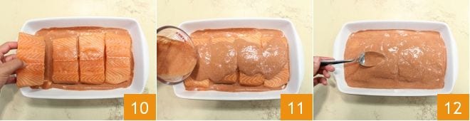 Once a base of sauce is created, place the 4 boneless salmon fillets, each weighing 200g (about 7 oz) 10, and pour the rest of the tandoori sauce over them 11, making sure to cover them completely 12.