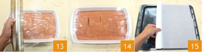 Cover the baking dish with plastic wrap 13, transfer it to the refrigerator, and let it marinate for 4 hours. After this time, take out the baking dish 14, then oil a baking tray and line it with parchment paper so that it adheres better 15.