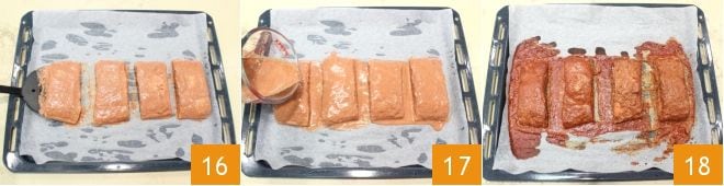 Now place the marinated salmon fillets on the baking tray, using a spatula 16, drizzle them again with the tandoori sauce you set aside 17, and bake them in a preheated static oven at 350°F for 25 minutes, if using a fan oven, cook at 320°F for about 20 minutes. When the sauce has set and the fillets are crispy 18, your tandoori salmon is ready to be served!