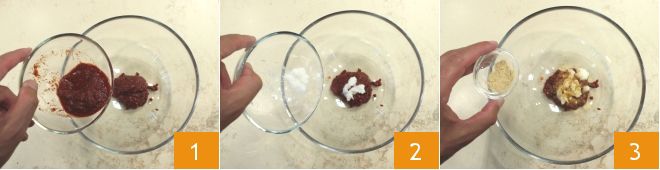 To prepare tandoori salmon, start with the marinade: pour the tandoori paste into a bowl 1, add the garlic paste 2 and ginger powder 3. You can find tandoori paste in ethnic stores, otherwise, you can use the garam masala mix, which is more common in supermarkets.