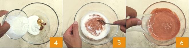 Add the plain yogurt 4 and mix the ingredients with a spoon for a few seconds 5, then pour in the lemon juice 6, which you have squeezed beforehand.