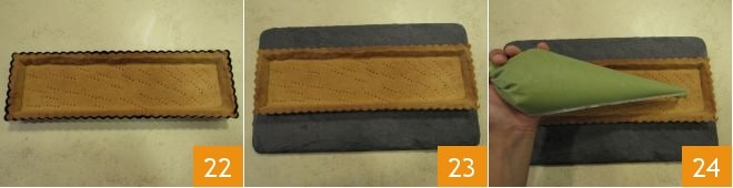 Bake in a preheated static oven at 340°F for about 15 minutes on the middle rack until golden brown 22. Then let it cool completely before unmolding 23. At this point, work the cream for a few seconds with a spatula, transfer it to a piping bag and use it to fill the tart 24.