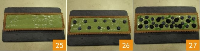 Then level the surface 25 and decorate with fresh blueberries 26, blackberries, and a few mint leaves. Your matcha tea tart is ready to be served 27!