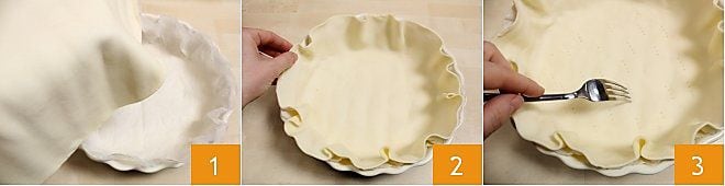 To prepare the tarte au fromage blanc, take a ceramic (or non-stick) baking dish with a diameter of 9.5 inches and line it with parchment paper cut to a 12-inch circle, wet it and squeeze it well. Dry the paper by dabbing it with a dry, clean cloth, then place it inside the dish so that it adheres well. Lay the puff pastry in the dish 1 and line the dish, making the pastry adhere to the sides 2. Prick the bottom with a fork 3 and place everything in the refrigerator.