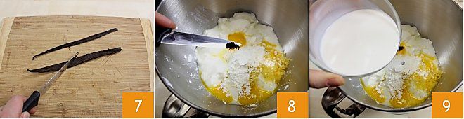 Cut the vanilla pod in half and scrape the seeds with the tip of a knife 7, then add them to the other ingredients 8. Finally, add cornstarch, salt, and cream to the bowl 9.