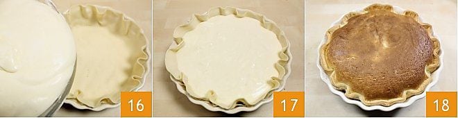 Pour everything into the puff pastry base, filling the mold to 3/4 of its height (16-17) and bake the tarte au fromage blanc in a static oven for about 1 hour at 356°F, until the surface of the cake is well golden 18. Remove the cake from the oven and let it cool on a wire rack: your tarte au fromage blanc can be served warm or cold!