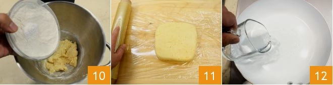 When the eggs are absorbed and the mixture is slightly whipped, pour in the sifted flour with the baking powder 10. Work the mixture to compact it, then place the crust on a lightly floured work surface and handle it just long enough to form a dough ball. Flatten it slightly with a rolling pin to give it a square shape, then wrap it in plastic wrap 11 and let it rest in the refrigerator for at least 30 minutes. In the meantime, focus on the tarte tatin filling: in a pan, pour the water 12