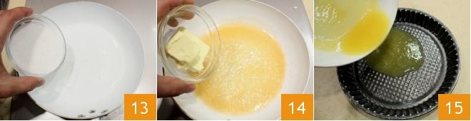 add half of the sugar 13 and caramelize over low heat by often rotating the pan without stirring: you must make a blonde caramel, without excessively browning the sugar. Then deglaze the caramel by adding the butter 14 and let it slowly melt. After that, pour it into a 8-inch diameter baking pan 15,