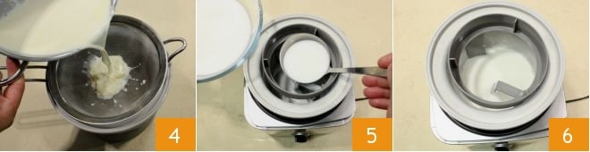 then let cool, then strain with a sieve to collect the cinnamon stick and any residues 4 and pour everything into the ice cream maker 5. Turn it on and let it run for at least 1 hour. When it is nice and creamy, stop the ice cream maker and place it in the freezer for about 3 hours before consuming if your ice cream maker does not have built-in cooling.