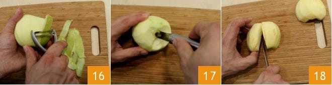 Then peel the apples 16 remove the core with an apple corer 17 (or with a knife) and cut them into 4 wedges each 18.