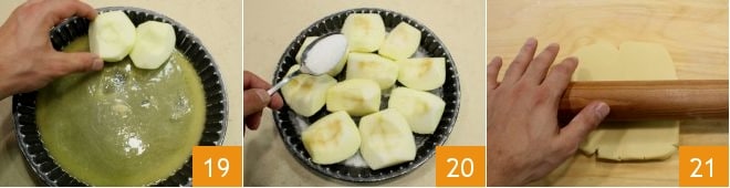 Distribute them in the pan with the concave side facing up 19, along the entire perimeter and in the center, then sprinkle with the remaining sugar 20. Bake the apples in a preheated static oven at 428°F for 15 minutes (for a convection oven at 392°F for 5-8 minutes). Meanwhile, take the dough ball, roll it out 21 into a disc 1/16 inch thick and 1 inch wider than the diameter of the baking pan;