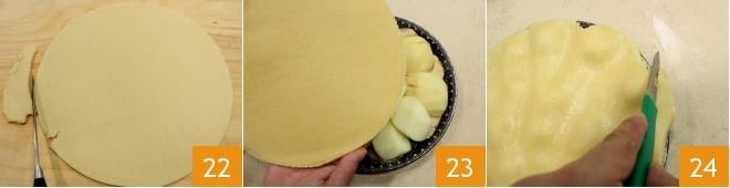into a disc 1/16 inch thick and 1 inch wider than the diameter of the baking pan; trim the edges with a knife 22, then remove the apples from the oven after the necessary time and lay the crust disc over them 23. Trim the excess outer part with a small knife 24