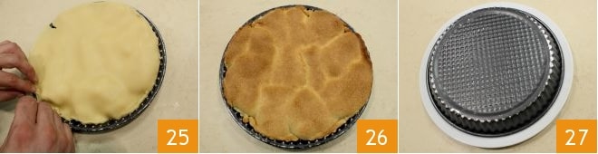 and pinch all around the dough to seal the crust well onto the filling 25; then place in a preheated static oven at 356°F for about 25-30 minutes (if a convection oven at 320°F for about 15-20 minutes). Once baked 26, remove the tarte tatin with condensed milk from the oven, let it cool slightly, and then flip it onto a serving plate 27.