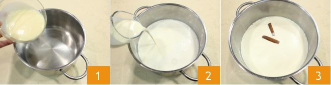 To prepare the tarte tatin with condensed milk and fiordilatte ice cream with cinnamon, start with the ice cream: in a saucepan, pour the condensed milk 1, add the milk and cream 2, then two cinnamon sticks 3. Bring to a boil,