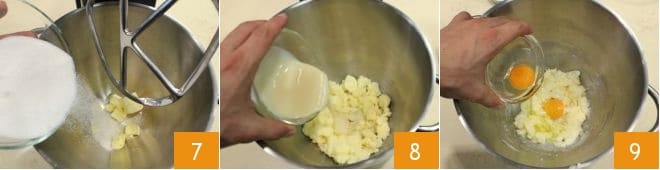 Then prepare the crust: in the bowl of a stand mixer (if you don't have one, you can make the dough by hand, first working the flour with the butter, then gradually adding the other ingredients) pour the cold butter from the fridge in pieces and the granulated sugar 7. Then add the condensed milk 8, the egg and the egg yolk 9, and a pinch of salt; then work the mixture with the whisk.