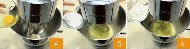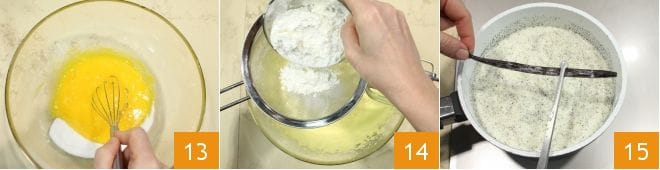 Meanwhile, beat the sugar and egg yolks with a whisk 13 and then incorporate the sifted flour 14. Extract the vanilla bean from the milk using kitchen tongs, which has cooled 15.