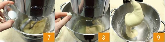 the salt and sugar 7. Once all the ingredients are absorbed, replace the paddle with the dough hook, add the softened butter, one piece at a time 8, waiting for it to be absorbed before adding another piece, continue kneading until all the ingredients gather around the hook 9.