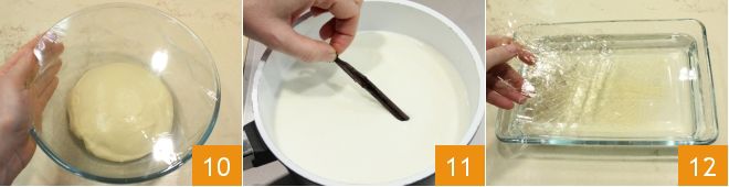 Transfer the dough onto a floured work surface, shape it into a ball, place it in a bowl, cover with plastic wrap 10, and let it rise for 2 hours at room temperature, then place it in the refrigerator to rise for 12 hours. In the meantime, prepare the cream: extract the seeds from the vanilla bean and infuse them in the hot milk along with the bean for about half an hour 11 and let the milk cool. Soften the gelatin sheets by placing them in cold water for 10 minutes 12.
