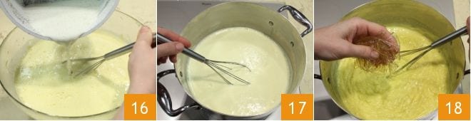 Pour the milk into the egg yolk and flour mixture 16, transfer it to a saucepan, and bring to the heat. Thicken the cream over low heat, stirring with a whisk 17; when the cream is thick, incorporate the softened and well-squeezed gelatin 18, stir to dissolve it in the cream. Turn off the heat and transfer the cream to a bowl, cover with plastic wrap in contact and let it cool at room temperature, then place it in the refrigerator covered with plastic wrap in contact.