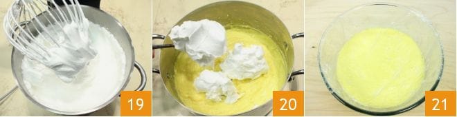 Meanwhile, whip the cream and when it is semi-whipped, add the powdered sugar and continue to whip for about 1 minute 19. Gently fold the whipped cream into the pastry cream with a spatula 20. Transfer everything to a bowl, cover with plastic wrap 21 and store the cream in the refrigerator.