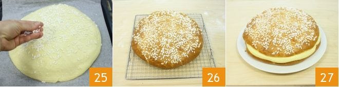 After the necessary time, take the brioche disc, brush the surface with the egg white, and cover it with granulated sugar 25. Bake the Tarte Tropézienne in a preheated static oven at 320°F for 50 minutes (in a convection oven at 280°F for 40 minutes); if it becomes too dark during baking, cover it with a sheet of aluminum foil. When baking is complete, remove it from the oven, and let it cool completely on a wire rack 26. Once cooled, cut it in half and fill it with the cream. The Tarte Tropézienne is ready to be enjoyed 27!
