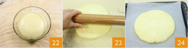 Take the risen dough 22, let it come to room temperature for a couple of hours before working it. Place the dough on a floured work surface, shape it into a ball 23, then take a sheet of parchment paper and draw the outline of a 9.5-inch diameter disc, roll out the dough on the outline and flatten it slightly; it should be about 1.2-1.6 inches thick. Transfer the disc onto a baking sheet 24, wrap it with plastic wrap, and let it rise again for an hour.