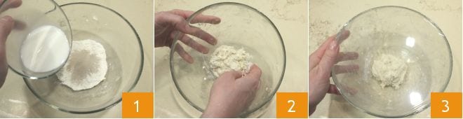 To make the Tarte Tropézienne, start with the starter: in a bowl, place the sifted flour (alternatively, you can use all-purpose flour), the dry yeast (or 0.4 oz of fresh yeast), and the milk 1, knead the ingredients by hand 2 until you get a soft mixture. Place the starter in a bowl, cover with plastic wrap 3, and let it rise for an hour in a warm place, like the oven turned off with the light on.