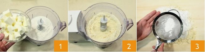 To make the mini tarts with frangipane cream and cherry jam, start by preparing the shortcrust pastry: place the sifted flour, a pinch of salt, and the cold butter from the fridge cut into cubes 1 in a mixer. Blend everything until you get a sandy and floury mixture 2; pour the obtained mixture onto a work surface (or into a bowl), create a well, and add the sifted powdered sugar in the center 3.