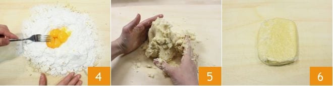 Pour in the egg yolks, then start mixing everything with a fork 4. When the eggs have absorbed the flour, you can continue by hand: knead briefly, just enough to compact the dough 5 so that the pastry doesn't heat up too much with the warmth of your hands and remains crumbly. Form a dough ball, flatten it so it cools more easily, and wrap it in plastic wrap 6, placing it in the refrigerator for at least 30 minutes.