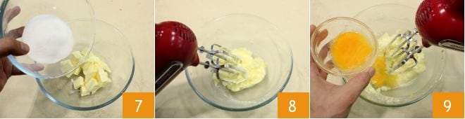 In the meantime, you can prepare the frangipane cream: in a bowl, pour the room temperature butter cut into pieces and the sugar 7. Work with an electric mixer with beaters 8, and when the mixture is well whipped, add one egg at a time 9, waiting for the previous one to be incorporated and continuing with the beaters.