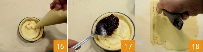 Then proceed to the filling: with the help of the piping bag, fill about 0.4 inches of the bottom of the mini tarts with the frangipane cream 16 and then finish with the cherry jam, filling the mold to the rim 17. Then proceed to the decoration: roll out the reserved shortcrust pastry to a thickness of 0.16 inches and then with a fluted pastry wheel cut strips 0.4 inches wide 18.